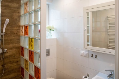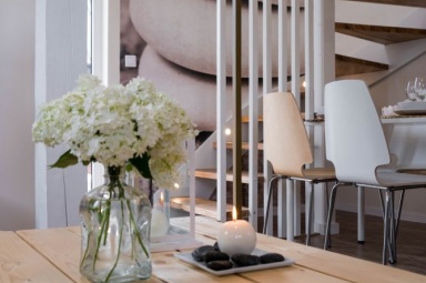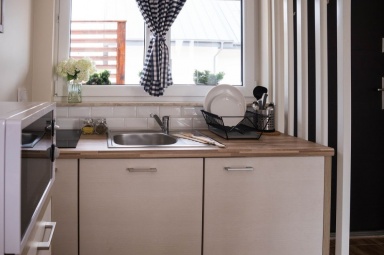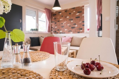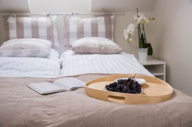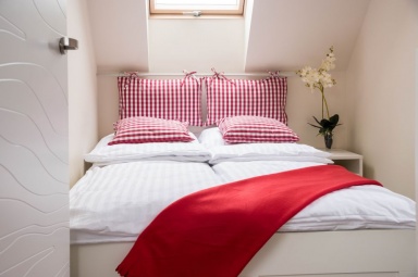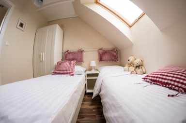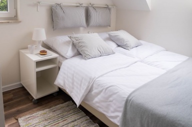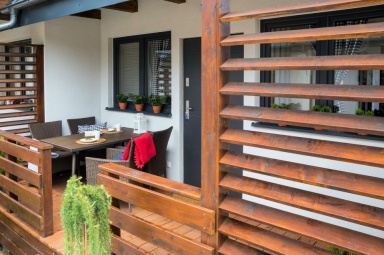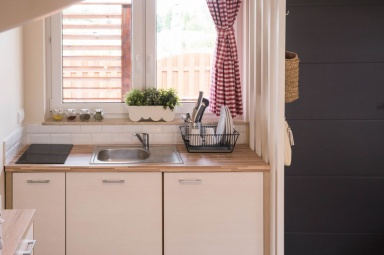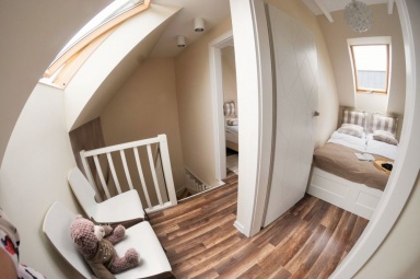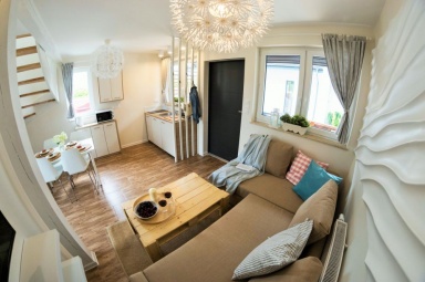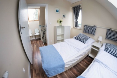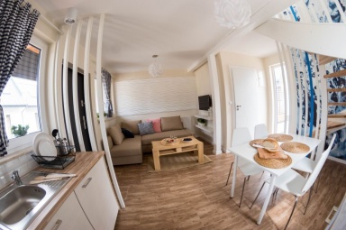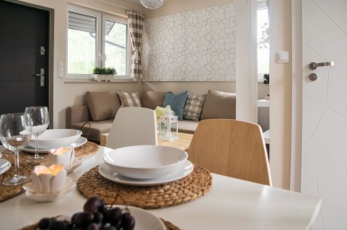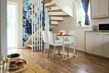 Przedstawiamy Państwu stylowe, w pełni wyposażone domki o wysokim standardzie, przewidziane dla 4 - 5 osób. Na parterze mamy salon z możliwością spania, w pełni wyposażony aneks kuchenny, łazienkę z prysznicem, a na piętrze dwie dwuosobowe, oddzielne sypialnie z szafą oraz regałem. Na piętrze znajduje się również wbudowana, pojemna szafa z lustrami. Na zewnątrz domków zadaszone tarasy z meblami ogrodowymi oraz grillem. Do dyspozycji gości suszarka na bieliznę, suszarka do włosów, 2 leżaki oraz parawan plażowy, podstawki dla dzieci w łazienkach. Dla najmłodszych bezpłatnie udostępniamy wyposażenie dodatkowe: łóżeczko turystyczne, krzesełko do karmienia, wanienka do kąpieli, barierka na schody. W domkach jest bezprzewodowy dostęp do internetu Wi-Fi i TV.